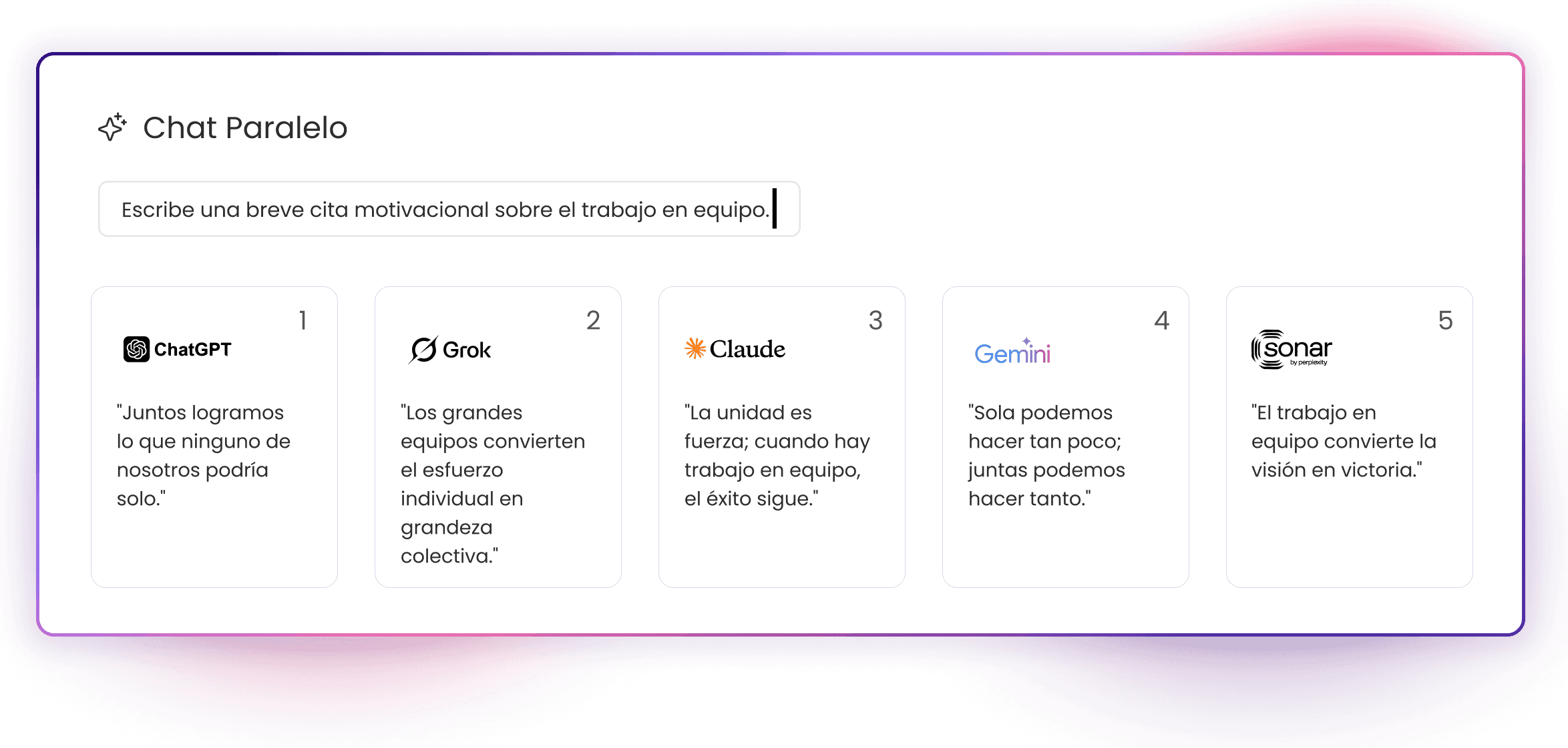 O Sabido Parallel Chat permite que você envie a mesma mensagem para vários modelos de IA e compare instantaneamente suas respostas em uma visão clara e organizada. Perfeito para equipes que testam prompts, avaliam precisão ou buscam insights diversos antes de escalar uma solução de IA.