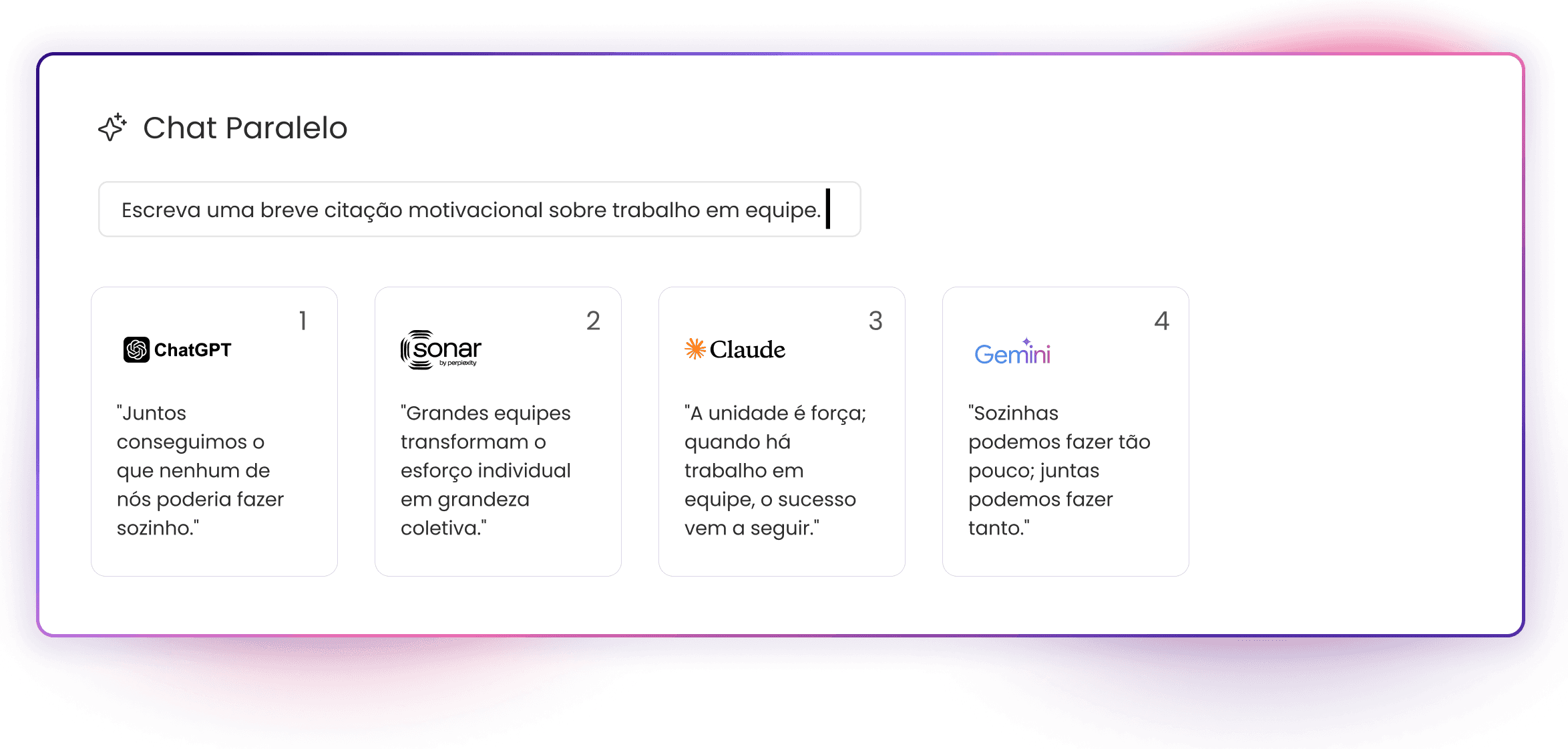 Com o Sabido Parallel Chat, você pode testar de 2 a 4 modelos de IA simultaneamente, ver suas respostas lado a lado, e fazer escolhas mais inteligentes e baseadas em dados para seus projetos.